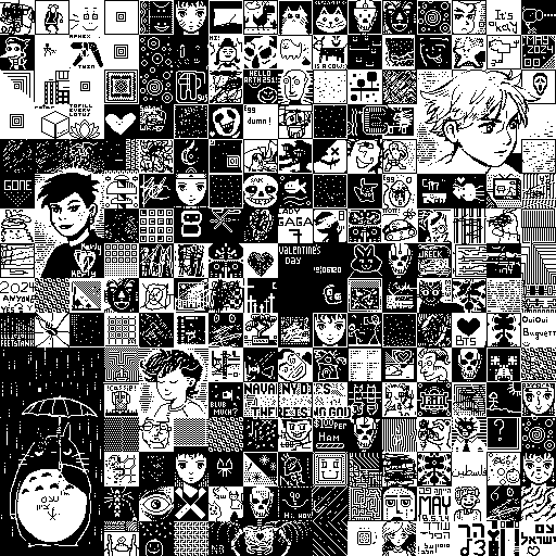 It should be noted that glyph imagery is nothing new. Mayans and Egyptians used glyphs, and the word 'glyph' comes from (ancient?) Greek ('carving'). More recently, there is the work of Kenneth Knowlton, who in the 1960's used computers at Bell Labs to create images composed of glyphs. I first encountered one of Knowlton's pictures -- which seemed to combine Chuck Close and the teletype -- at the School of Visual Arts in the early 1990s. The present project does, however, shift the focus of authorship. It is an image-making system that can be altered from all over the Internet. It's not clear who owns the collaborative image. For my part, I encourage you to use it any way you see fit. I look forward to seeing what images develop. Finally, if you don't like the options given to you, please revise the source code. Copy it. Steal it. Share it. Print it. Pretend it's yours. I don't care.